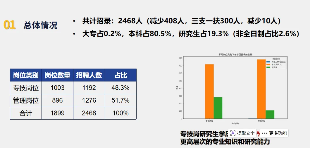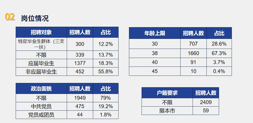 本次招录数:2468人,本次招聘应届毕业生岗位招录人数达1677人,占比高达67.9%,成为本次招聘的主力军,同时部分岗位年龄上限放宽至38周岁。