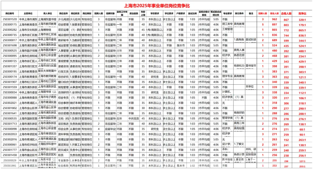 报考条件:上海户籍无限制;非沪籍应届生不限;非沪籍往届生需居住证满1年;一般38周岁以下;大专占0.2%,本科占80.5%,研究生占19.3%