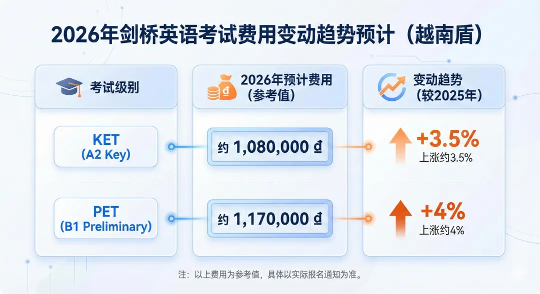 根据最新发布的考试方案,2026年剑桥各级别考试(从Starters到PET)的报名费用均出现了小幅上调。