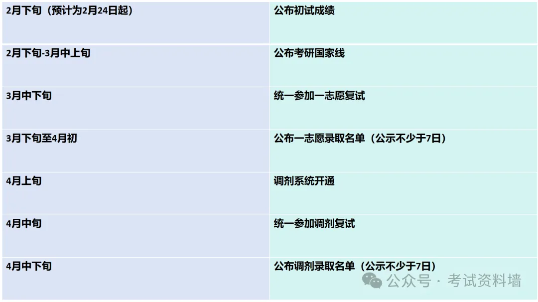 初试成绩公布 👉 国家线公布 👉 自划线公布 👉 复试方案公布 👉 举行一志愿复试和调剂复试
