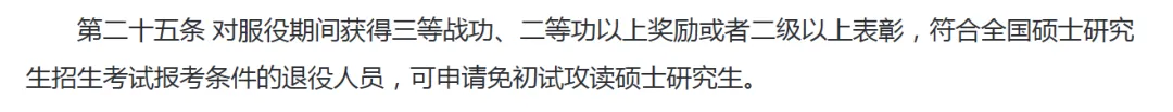 加分政策新增:对服役期间获得三等战功、二等功以上奖励或者二级以上表彰,符合全国硕士研究生招生考试报考条件的退役人员,可申请免初试攻读硕士研究生。