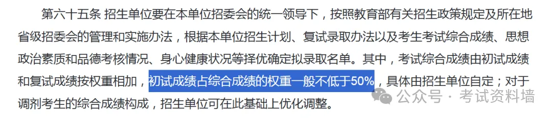 教育部明确规定:考试综合成绩由初试成绩和复试成绩按权重相加,初试成绩占综合成绩的权重一般不低于50%,具体由招生单位自定;对于调剂考生的综合成绩构成,招生单位可在此基础上优化调整。