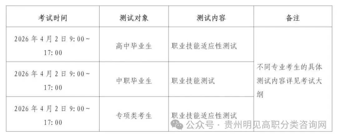 (1)文化综合考试为全省统一组织的文化综合考试,文化综合考试包含语文、数学、英语三个科目的内容。按照《贵州省中职生报考高职(专科)院校分类考试文化综合考试说明》要求执行,考试成绩按100分制计入录取成绩。考试时间为2026年3月14日9:00-11:30。