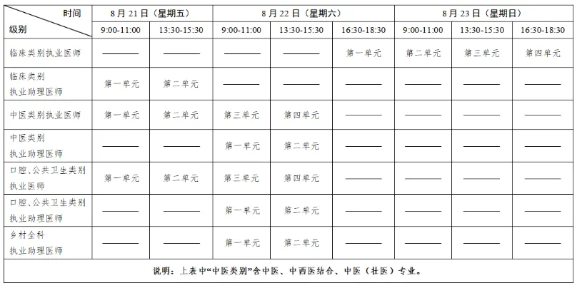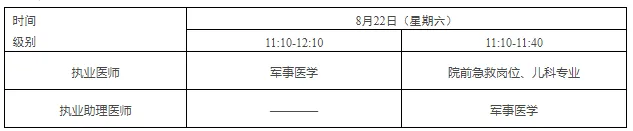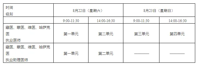 考试实行计算机化考试,军队现役人员、文职人员加试军事医学,院前急救岗位和儿科专业加试相应内容。中医类别藏医、蒙医、维医、哈萨克医专业实行纸笔考试。统一考试时间如下: