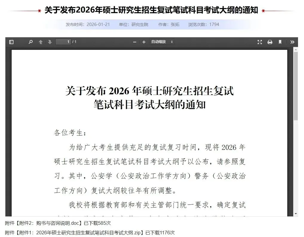 中国人民警察大学发布2026年硕士研究生招生复试笔试科目考试大纲的通知。