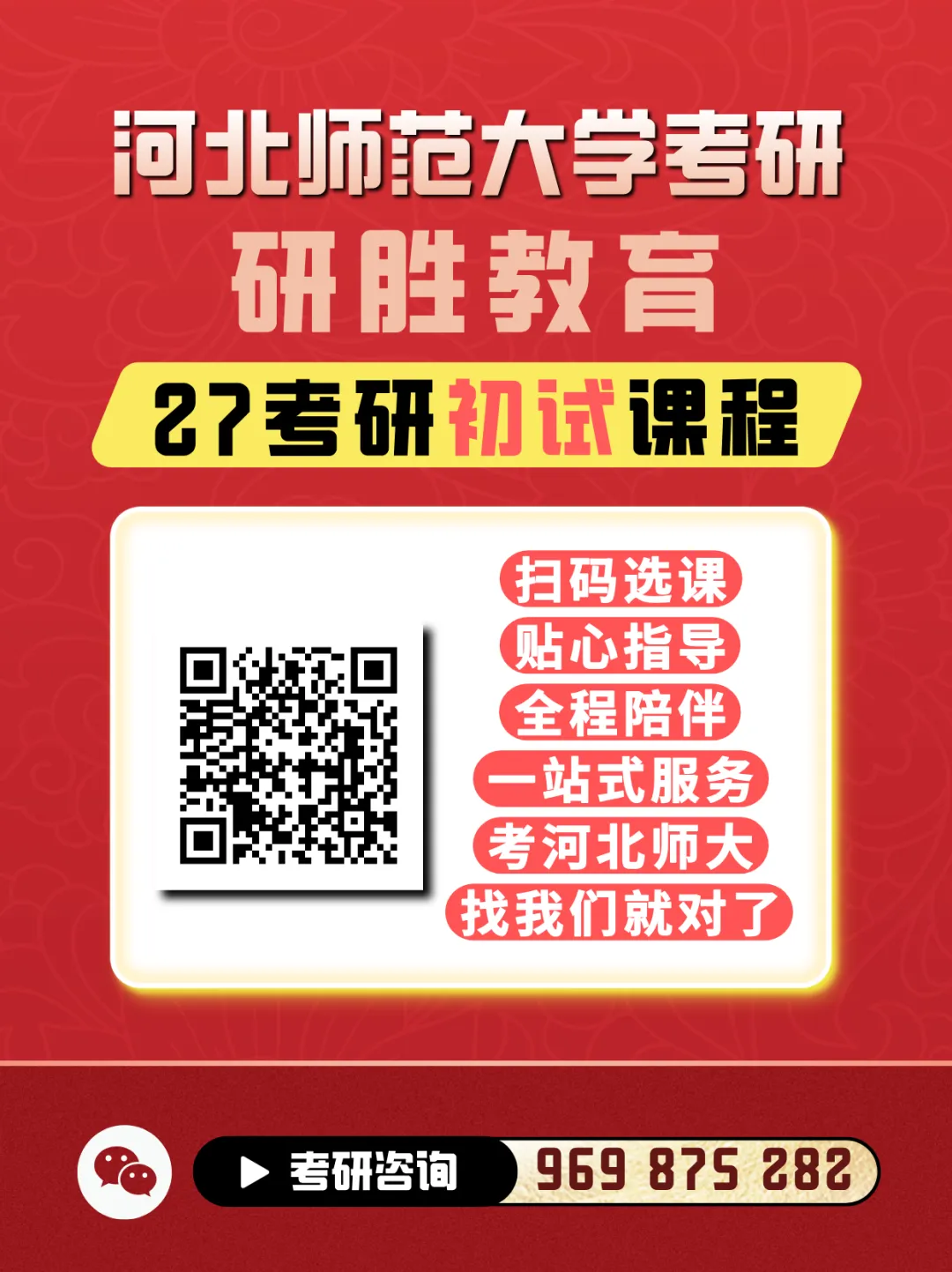 "研胜教育"是专注于河北师范大学考研的服务平台,自2012 年成立以来,一直秉承"用良心、做考研"的宗旨,为各位研友提供考研服务。河北师范大学考研加油站现有业务包括如下:"大白"学长欢迎各位同学联系咨询。微信:422571881考前咨询:各专业对比,针对个人情况,精准选择,让您赢在起跑线上。权威资料:历年考研真题,官方、高分学长学姐权威资料,让您心有所依,轻松备考。高端辅导:高分考研团队一对一辅导,量身定制复习规划,详细剖析重点难点,全局把握内容脉络,随时随地查漏补缺,心贴心的课后服务。远程授课,无地域限制!精品小班:高分考研团队精品小班,精讲重点、传授方法、答疑解惑。让你摒弃疑惑,事半功倍。全程服务:凡购买资料或报班的同学,自动成为研胜教育的尊贵会员。享受全程的考研服务。考研加油站,一直被模仿,从未被超越。欢迎各位同学联系咨询。祝各位同学金榜题名,圆梦师大!