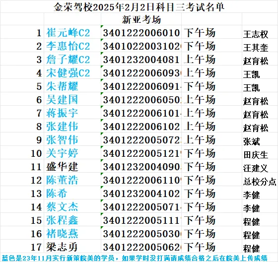 通知:2月2日科目一考试(场次一)下午12:50(场次二)14:40到肥东交警大队体检站门口集合,考试学员由各自教练带队到考场,(学员自己到考场或早到不要到处走动,以免错过点名)不能迟到,迟到按缺考处理,学员要携带身份证及学员证,检查身份证背面有效期,进入待考大厅及考试过程中,不准穿戴墨镜、帽子、背心、裙子、短裤、高跟鞋、拖鞋、睡衣、睡裤,女学员头发要扎起来。进入侯考区域内不可以玩手机,要保持安静,不得喧哗。祝所有学员顺利通过2月2号预约新亚考场科目二的学员