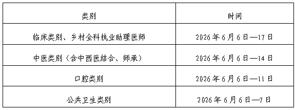 2026年,报考临床、中医(含中西医结合、师承)、口腔、公共卫生类别的考生参加医师资格考试实践技能考试均在国家实践技能考试基地进行,考试合格者,成绩2年有效;报考乡村全科执业助理医师的考生,成绩限当年有效。具体考试时间和地址详见准考证。
