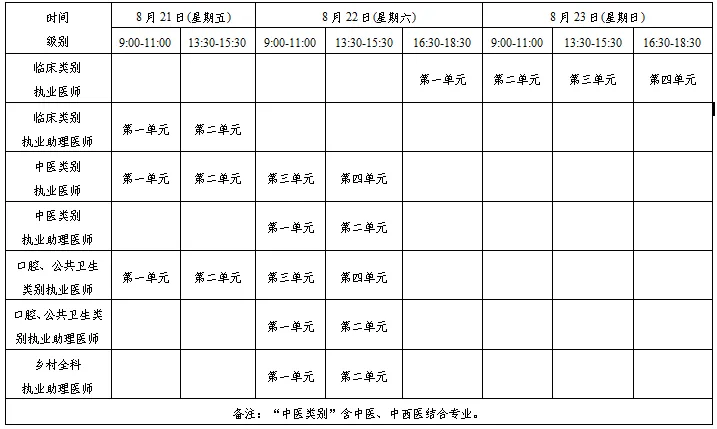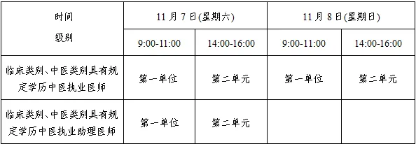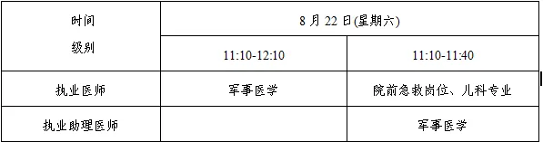 医学综合考试均为计算机化考试,军队现役人员、文职人员加试军事医学,院前急救岗位和儿科专业加试相应内容。统一考试时间如下: