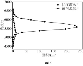 研究表明,长江河源(简称长江源)和黄河河源(简称黄河源)的植被分别以高寒草原和高寒草甸为主,近几十年来两流域冰川出现不同程度的退化,但黄河源冰川对气候变化的敏感性更高。读长江源和黄河源冰川面积-海拔分布图(图5),据此,完成12-13小题。
