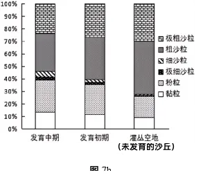 柽柳是一种落叶灌木,具有庞大根系、分枝能力强等特点,是发育沙丘的常见植物。图7a和图7b分别为柽柳沙丘的发育过程(部分)以及过程中沙粒粒径的变化。