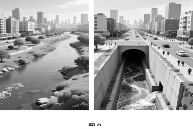 埃姆舍尔河流经德国鲁尔区,19世纪以来,随着鲁尔区煤炭、钢铁等工业的快速发展,河流沿岸聚集了大量工矿企业,河水被严重污染,成为欧洲著名的“污水沟”。同时,由于地下采矿导致地面沉降,河流自然水系被破坏,部分河道被改为人工修筑的地下暗渠,失去生态功能。20世纪80年代,鲁尔区开始转型,埃姆舍尔河流域被列为重点治理区域。通过修建污水处理设施、恢复自然河道等一系列措施,埃姆舍尔河水质逐渐改善,沿岸景观焕然一新,成为休闲旅游和生态教育的场所,并带动了周边城市产业更新与转型。图8示意天然河道(左图)和地下暗渠(右图)