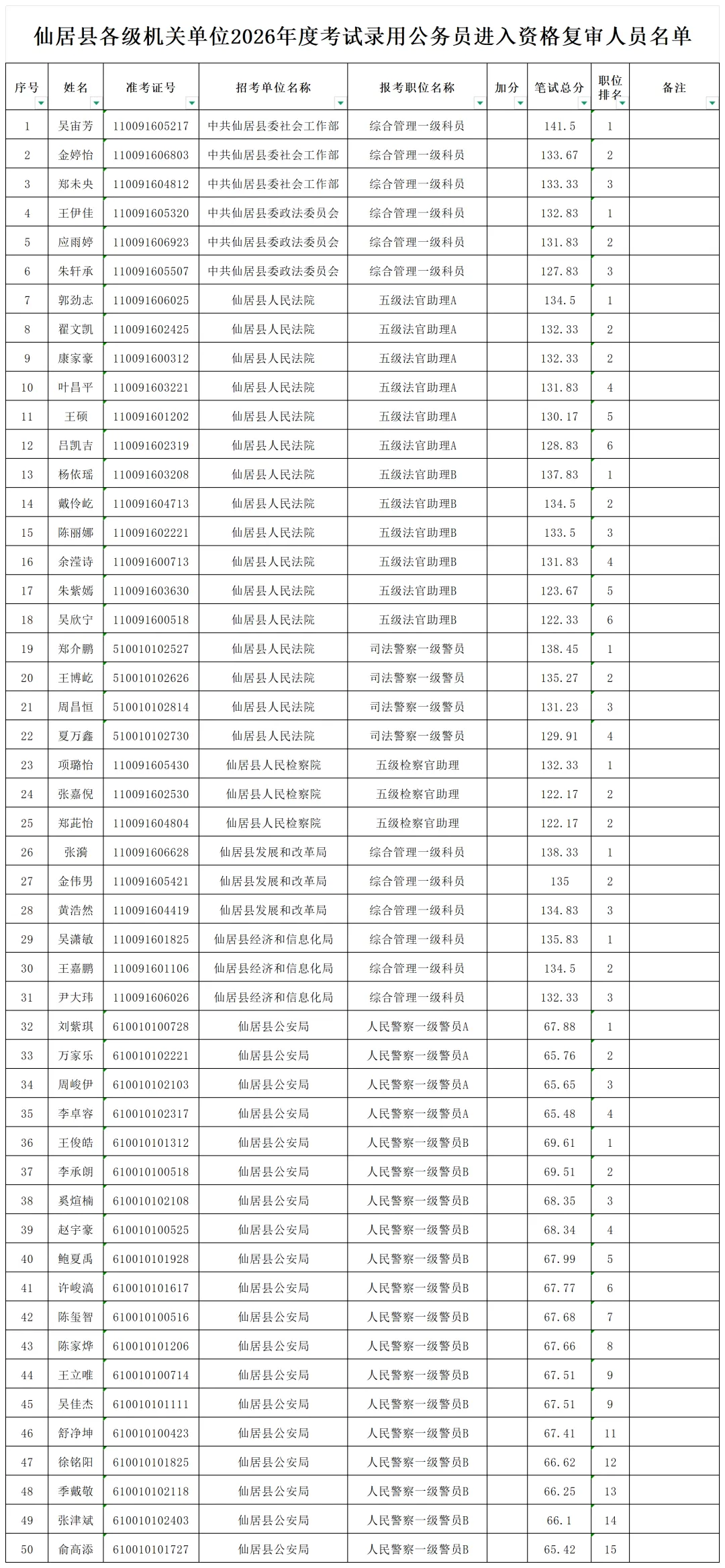 根据《仙居县各级机关单位2026年度考试录用公务员公告》规定,仙居县各级机关单位考试录用公务员笔试成绩公布后,招录机关根据各招考职位的笔试总成绩,在合格人员中按规定比例从高分到低分确定体(技)能测评和面试对象。面试或体(技)能测评前须进行现场资格复审。现就仙居县各级机关单位考试录用公务员资格复审等有关事项通知如下:
