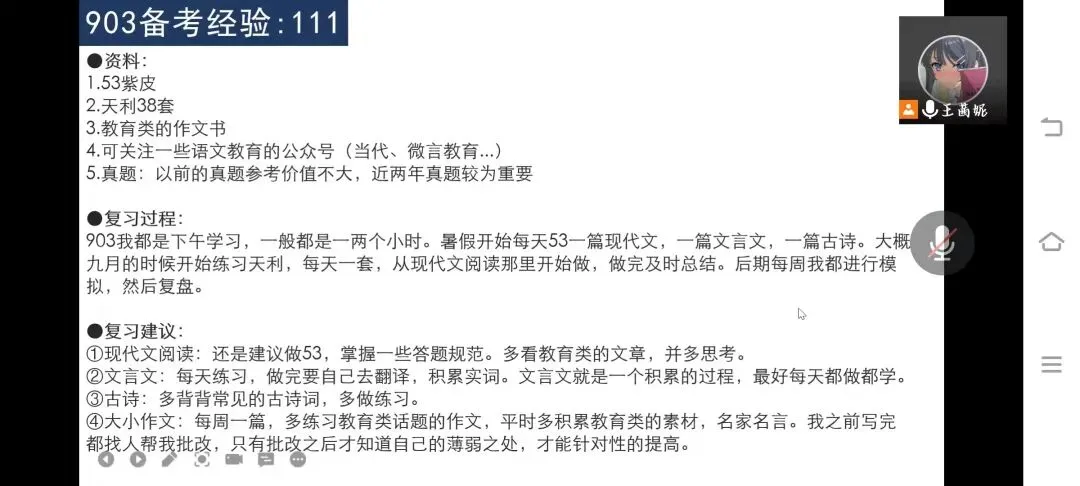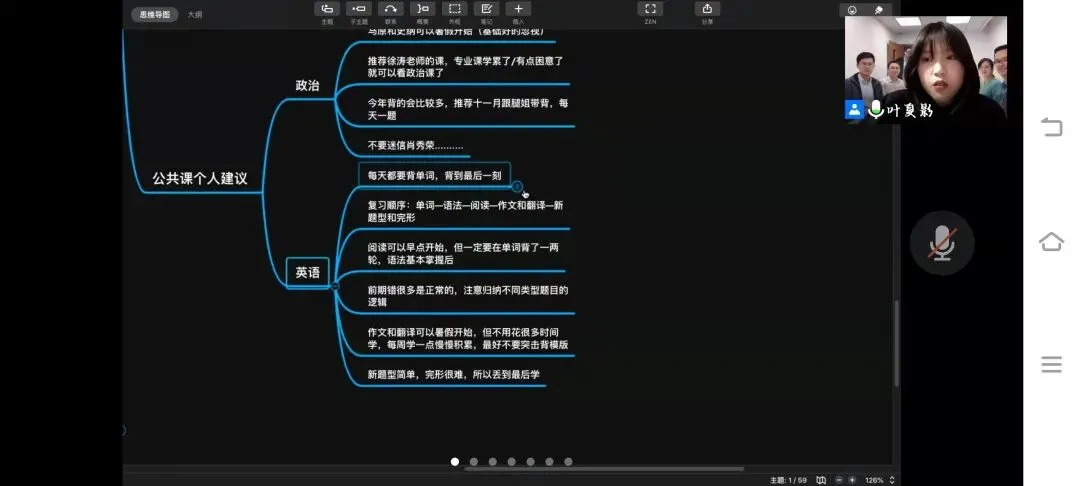 本次分享会采取线上方式进行,两位同学依次担任主讲人,分享自身考研经历。叶夏影同学通过思维导图的形式,分择校、复习和实习三个模块讲述。她提到了作为师范生所必须面对的实习与考研复习时间冲突的问题,提供了自己妥善处理矛盾的经验,即规划好复习进度,提前考虑实习的不确定性等等。