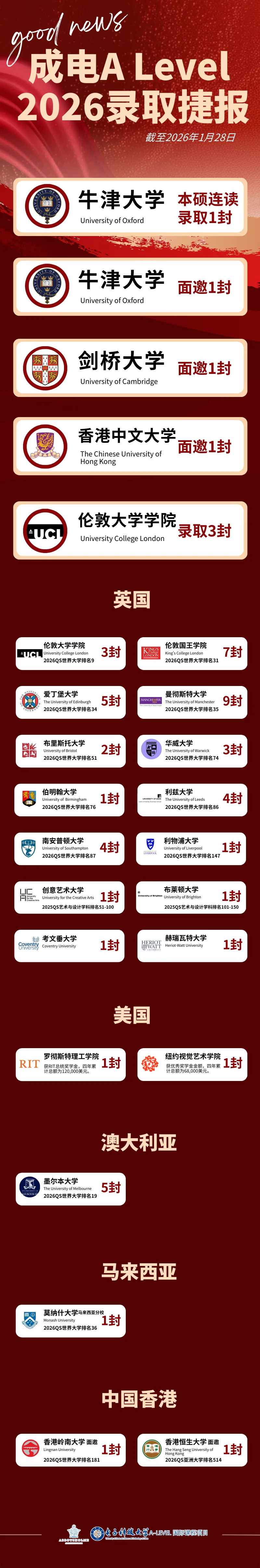 同时,成电A Level学子在英国名校录取方面延续辉煌,连续三年收获“王爱曼华”名校录取,包括伦敦国王学院、爱丁堡大学、曼彻斯特大学等知名院校的正式录取通知。