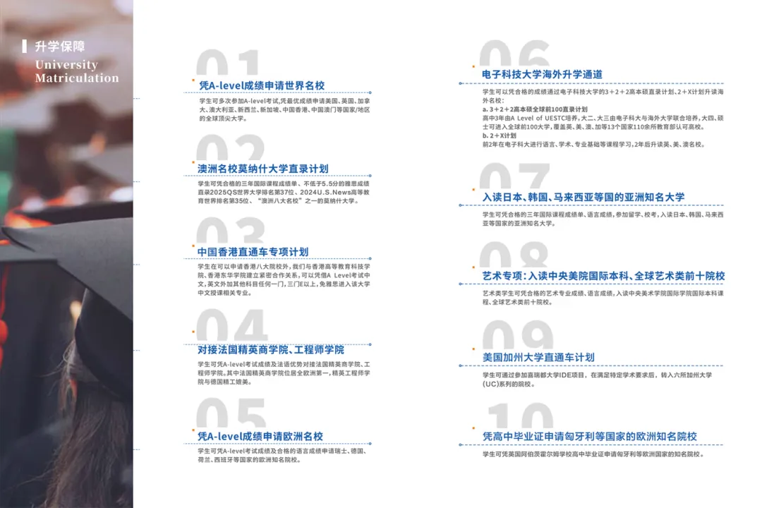 学生入学即注册英国阿博茨霍尔姆学校学籍,可凭A Level成绩直接申请全球160多个国家及地区的知名院校,并享受与英国本土学生同等的升学通道。