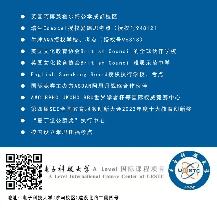 成电A Level作为由教育部直属重点大学电子科技大学自主招生、自主办学、自主管理的官方项目,学生从入学起,便能全程共享电子科技大学的顶尖学术资源。