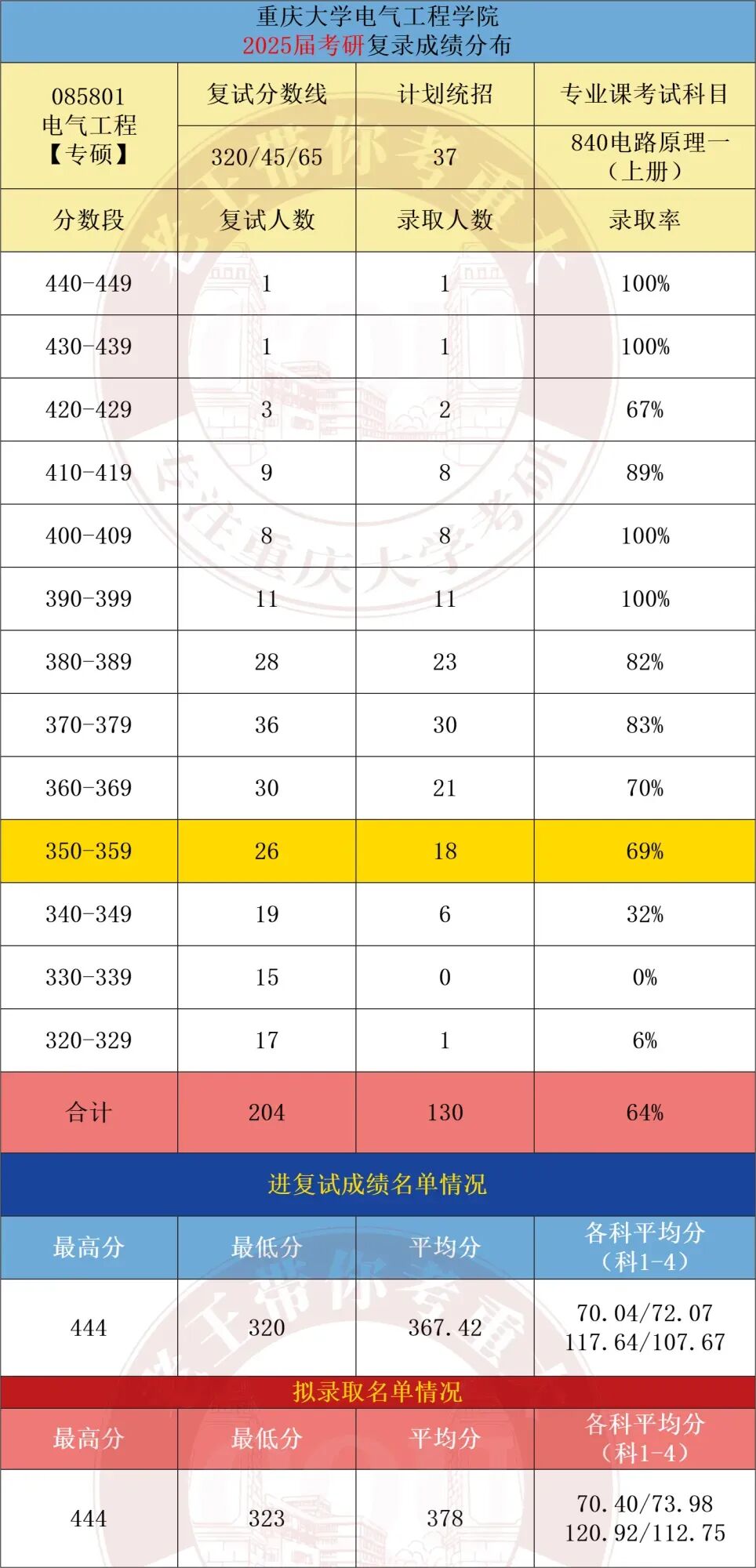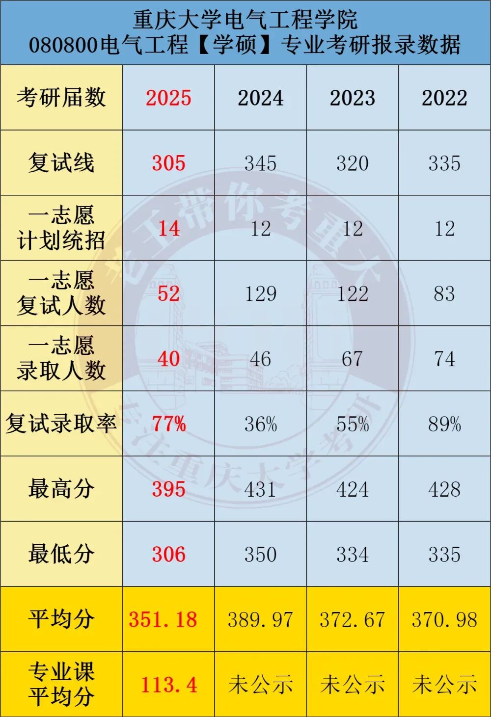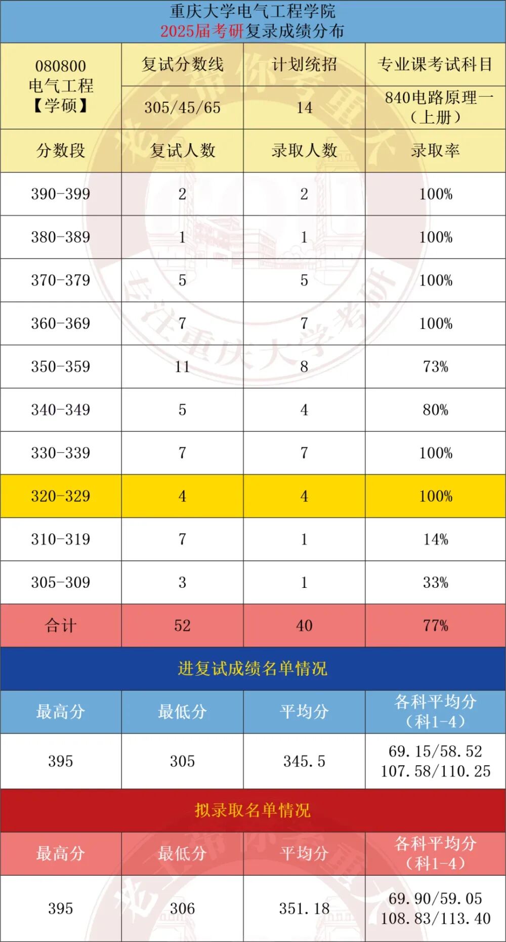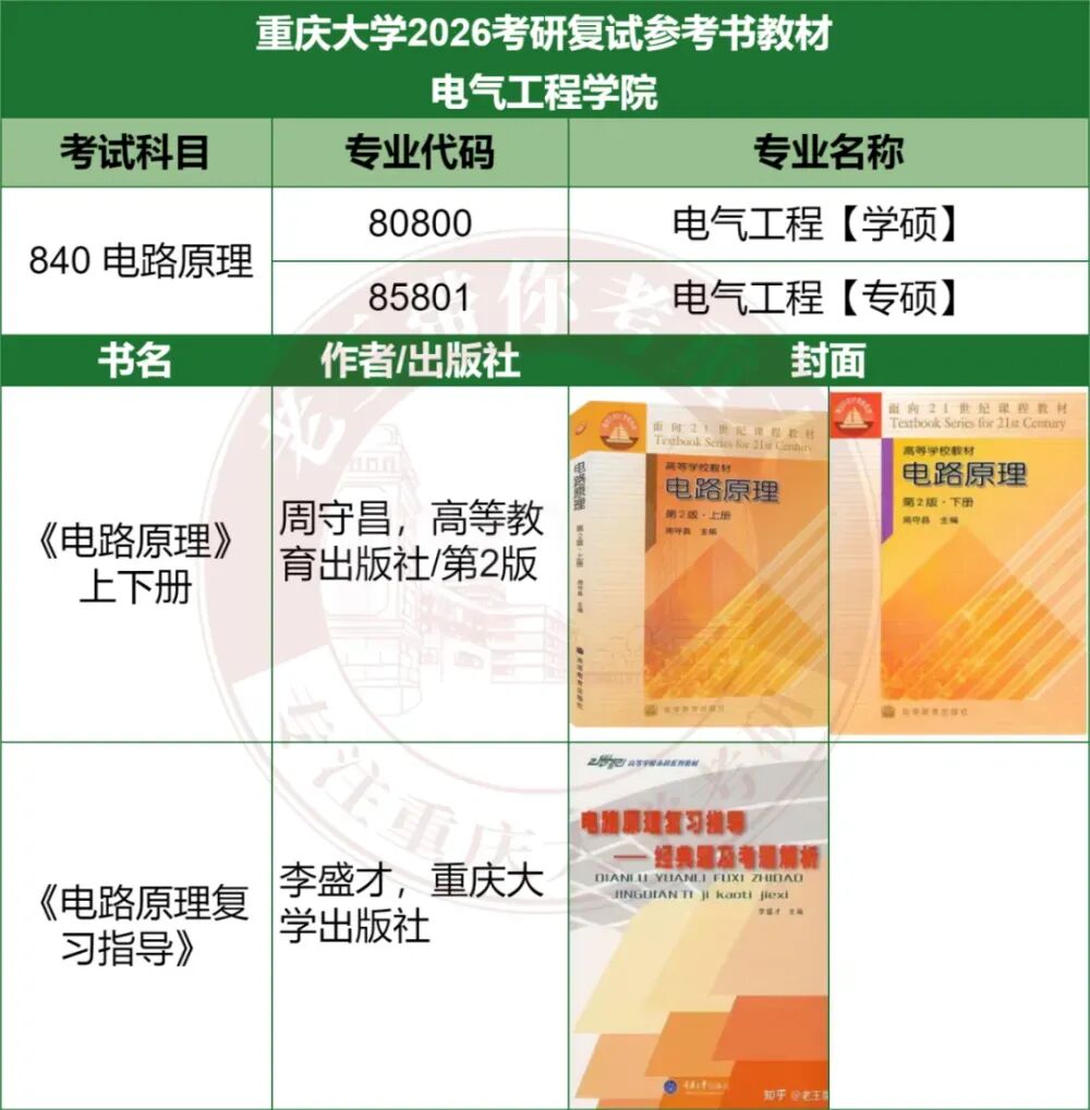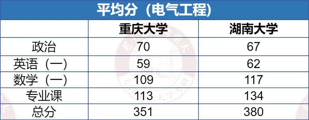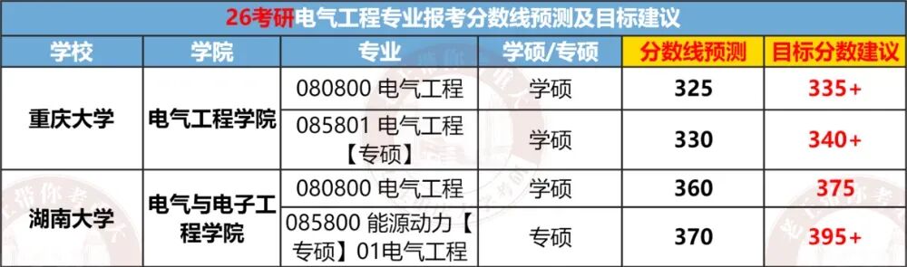 对比总结:两地在地理位置和就业前景上各具优势,根据个人喜好选择。080800 电气工程:① 101 思想政治理论、② 201 英语(一)、③ 301 数学(一)、④ 840 电路原理085801 电气工程 【专硕】:① 101 思想政治理论、② 204 英语(二)、③ 302 数学(二)、④ 840 电路原理080800 电气工程:①101思想政治理论 ②201英语(一) ③301数学(一) ④821电路085800能源动力 01电气工程:① 101思想政治理论、② 204 英语(二)、③ 302 数学(二)、④821电路邱关源,《电路》(第五版或第四版),高等教育出版社学硕: 25届实际录取40人(计划14人,扩招近2倍)。专硕: 25届实际录取130人(计划37人,扩招近10倍!)。25届学硕与专硕均出现显著扩招,专硕规模更是创近年新高,预计26届扩招趋势或将延续。分数线全面下降,性价比极高,尤其是专硕考英二数二,性价比更是拉满!学硕: 25届进复试52人,录取40人,录取率77%。竞争程度相对友好,存在过线即录取的情况,但低分段竞争相对激烈。专硕: 25届进复试204人,录取130人,录取率64%。对比学硕,竞争稍显激烈,但属于合理范围内。学硕:25届实际录取25人,计划统招24人,持平;专硕:25届实际录取54人,计划统招24人,扩招1倍。从三年数据来看,湖大电气学硕招生人数趋向稳定,招生人数在25人左右。专硕对比往年有所扩招。学硕:25届复试线为356分(较24届年下降6分)。专硕:25届复试线为377分(较24届上涨9分)。湖大电气分数线还是比较高的,而且在近两年全国考研形势大降温的情况下,还保持较高分数。学硕:25届进复试33人,录取25人,录取率75%。低分段竞争比较激烈,需要考到375分以上才比较稳妥。专硕:25届进复试69人,录取54人,录取率78%。同样也是低分段竞争比较激烈,想稳妥,那得考到390分以上,分数要求比较高。对比重大和湖大各科的平均分,能明显看出湖大分数高出不少。数学最能体现考生的水平差距:湖大数一平均分117,重大则不到110;数二湖大127,重大近120。由此可见,报考湖大的考生整体实力更强,对应的竞争压力也更大。再看总分平均分,湖大平均分更是高得离谱,专硕平均分近400分,而且前2年平均都是在400分以上。重大招生人数远多于湖大,是湖大2倍多,上岸机会更大。重大电气分数线出现了比较大的下降趋势,尤其是学硕,低至305分!而湖大的分数线,近三年居高不下。两校的录取率差不多,都是相对适中的。但湖大本身分数高,招生少,门槛更高。相对重大来说,湖大难度更高。这也凸显了重大的超高性价比,不仅学科实力强,作为电气五虎之一,分数线低、招生多,好上岸。①优先重庆大学——扩招红利显著,分数线低且竞争温和,适合中等基础考生冲刺985。②湖大仅适合高分、基础好的选手,数学不好的同学一定要慎选!结论:重庆大学性价比突出,尤其25届“低分+扩招”双重优势,26届趋势延续,强烈推荐!两校每年进电网的人数都不少,尤其是重庆大学,常年稳居全国前 10,老牌电气强校的实力果然名不虚传。湖南大学:电气毕业生的就业地区分布呈现出以长沙为中心,除长沙外,毕业生还分布在多个城市,如苏州、杭州、福州、深圳、重庆、合肥、西安、郑州、武汉等不同省份,覆盖了中国东部、南部、西部和中部地区。进电网的还是不少!重庆大学电气工程专业毕业生就业面广,主要进入国家电网、南方电网、电力系统、新能源企业、互联网公司、硬件厂商等,薪资待遇优厚,职业发展路径多元。电网是重庆大学电气工程毕业生的主要去向。2023届数据显示,约75%的毕业生入职国家电网或南方电网系统。包括省地级市电网公司,如重庆电力公司、四川电力公司等。根据重庆大学2023届电气硕士毕业生数据:电网就业165人,私企20人,其他国企、政府选调生、高校读博、军队文职等占一定比例。整体就业稳定,薪资水平在行业内居中偏上。比起本科生,研究生更受新能源、互联网公司青睐。私企大厂也有不少,例如比亚迪、阳光电源、大疆、华为等。篇幅受限,仅展示部分,完整版进qun滴滴学长学姐: