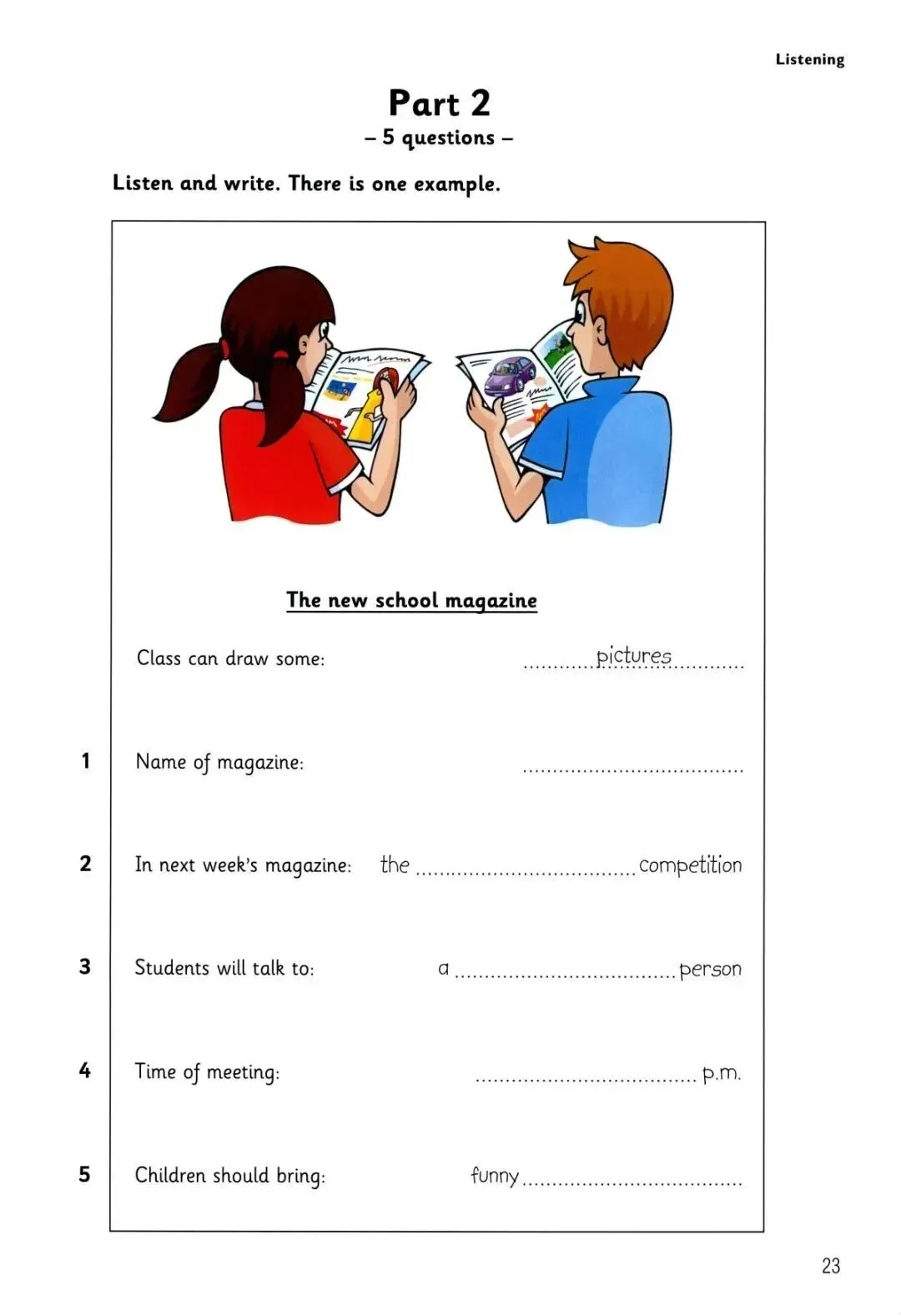 A2 Flyers听力测试分为五个部分。每个部分都以一两个示例开头,同学们将听到每个录音两次。