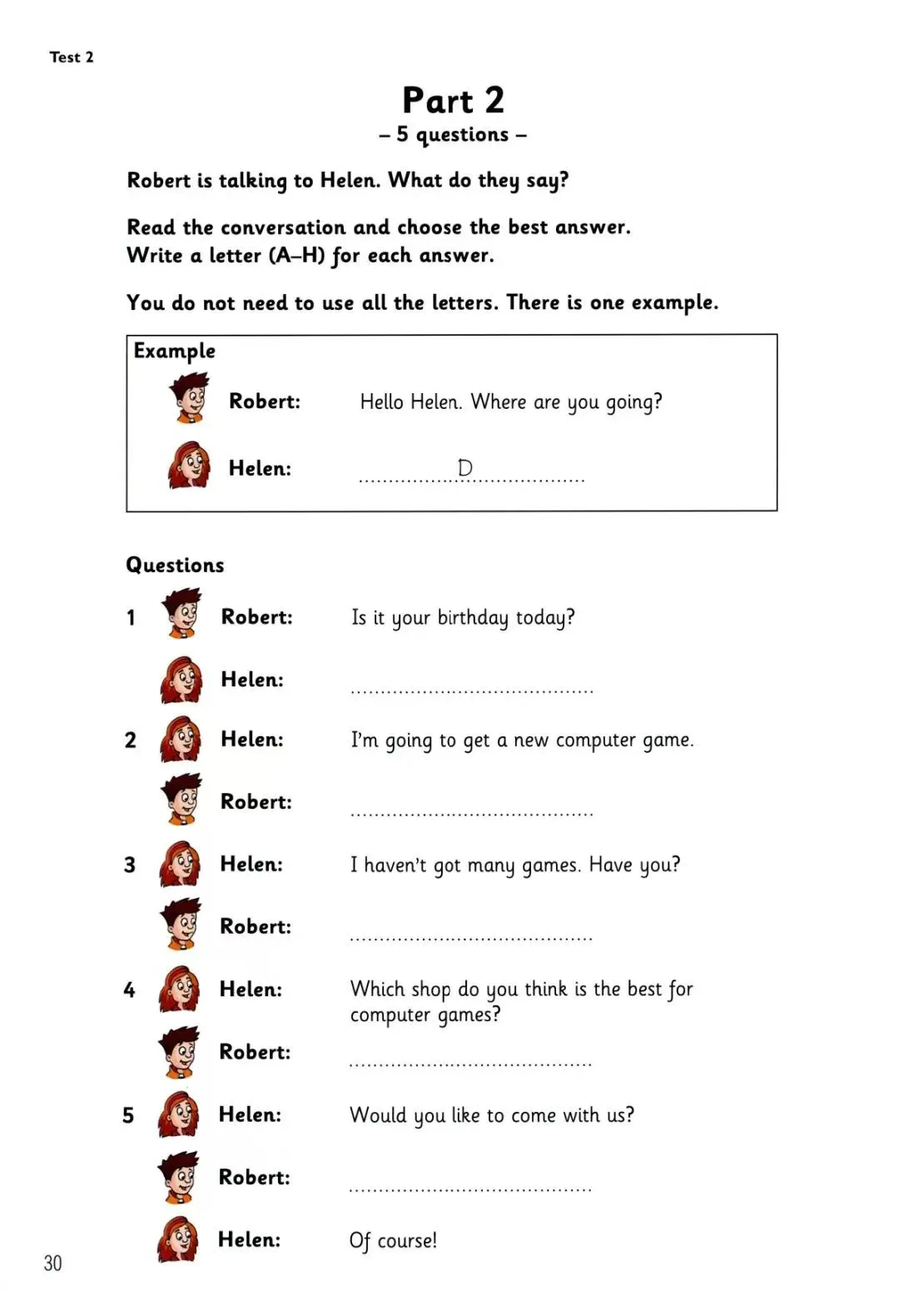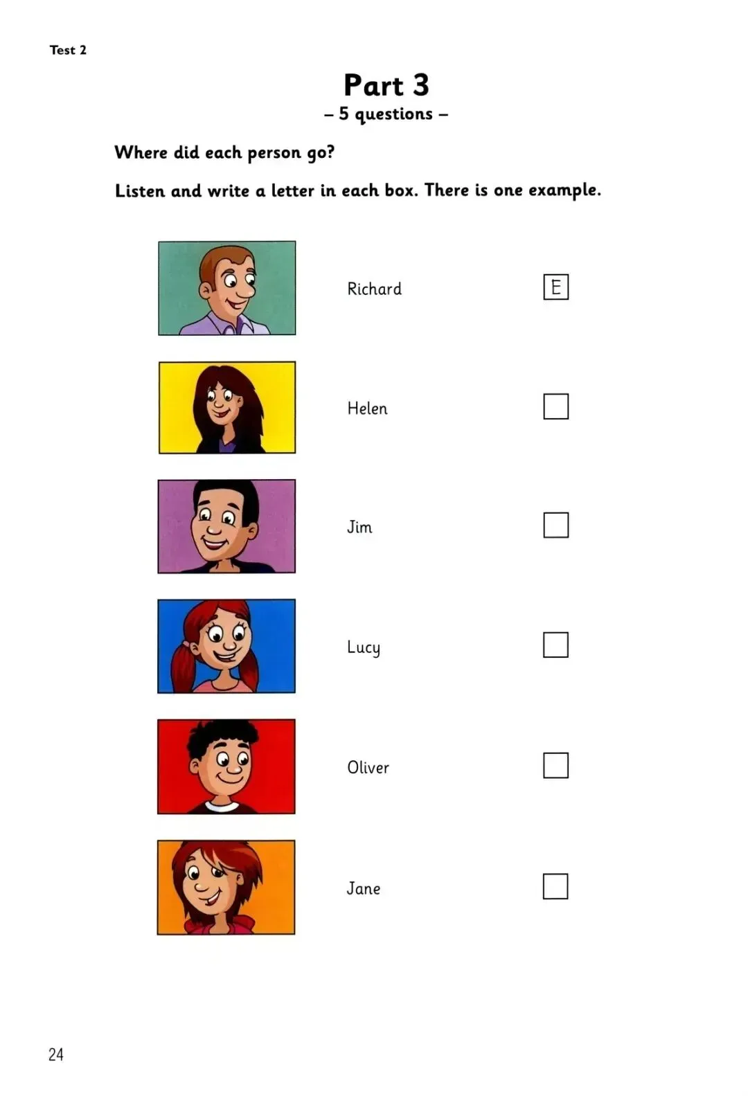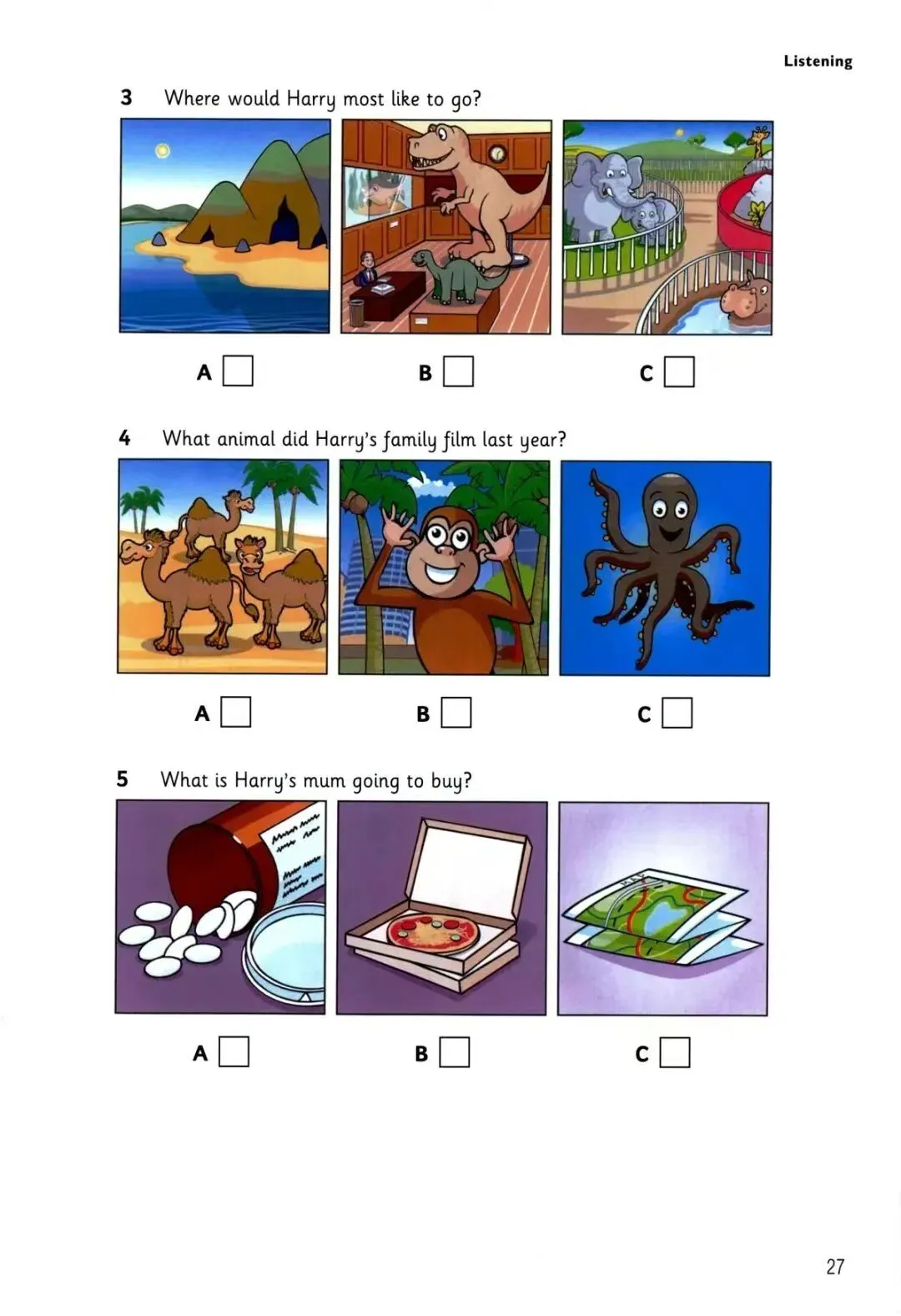 五次简短的对话。每个对话都有一个问题和三张图片。孩子们必须决定哪张图片显示了问题的正确答案,并在其下方的框中打勾。