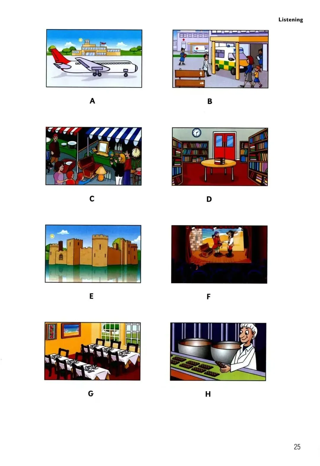 两组图片。在左边,有一些人物及其名字的图片,或其他命名的地点或物体。在右边,有一组有字母但没有文字的图片。同学们必须听两个人之间的对话,并将右边的每张图片与左边的一张命名图片相匹配。