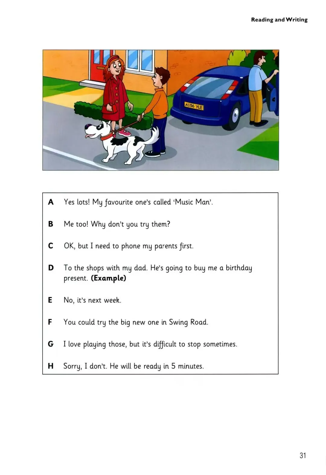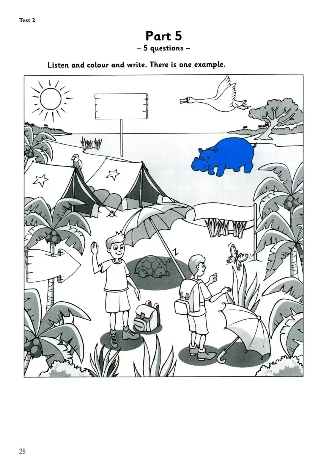 一幅大图。孩子们必须仔细聆听成人和儿童之间的对话,并为其中三个问题涂上不同的物体,并为图片中的两个问题写一个单词。