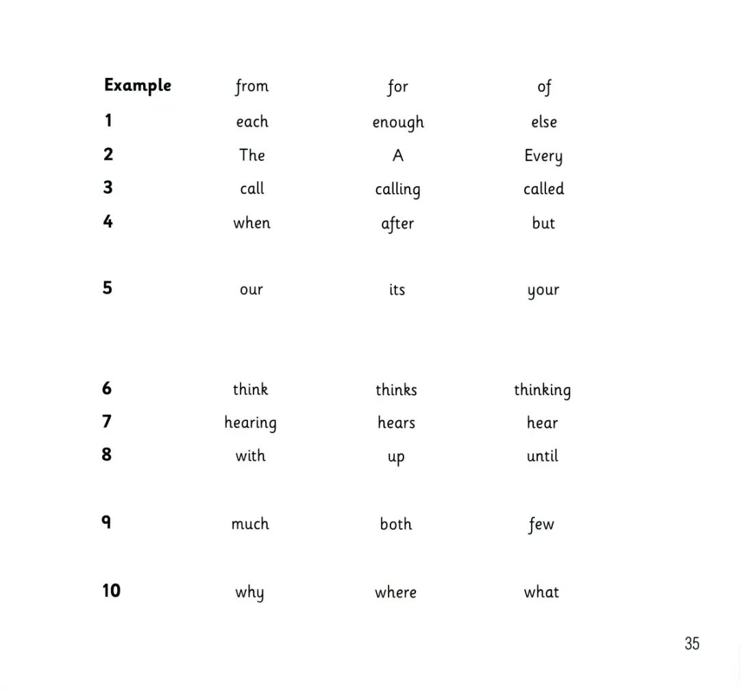 缺少一些单词(空白)的文本。在缺少每个单词的行旁边,有三种可能的答案可供选择。孩子们必须决定哪个答案是正确的,并将单词复制到空白处。