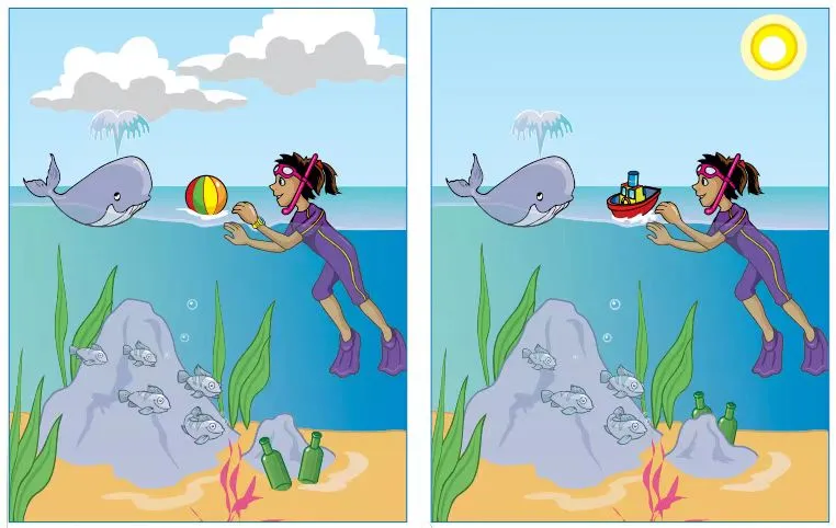 描述两幅图片的不同点时,可以谈论颜色、大小、数字、位置、人或物的样子、人们的动作等等。