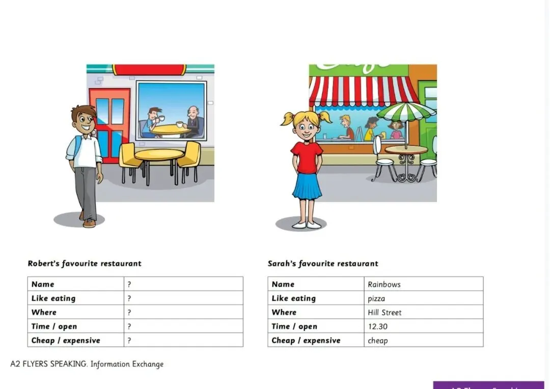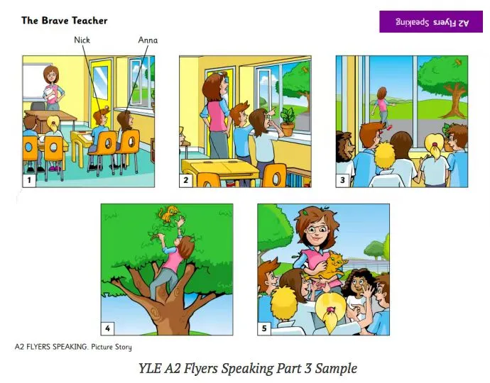 A2 Flyers 口语测试分为四个部分。孩子们与考官单独参加考试,但他们认识的会说他们语言的人(如他们的老师)会把他们介绍给考官,并用他们自己的语言解释该怎么做。