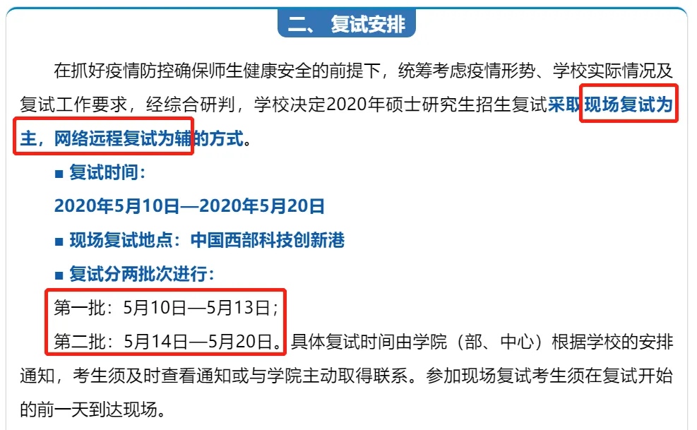 西交官宣采用现场复试为主,网络远程复试为辅的方式,分两批进行复试,第一批5月10号到5月13号,第二批5月14号到5月20号。