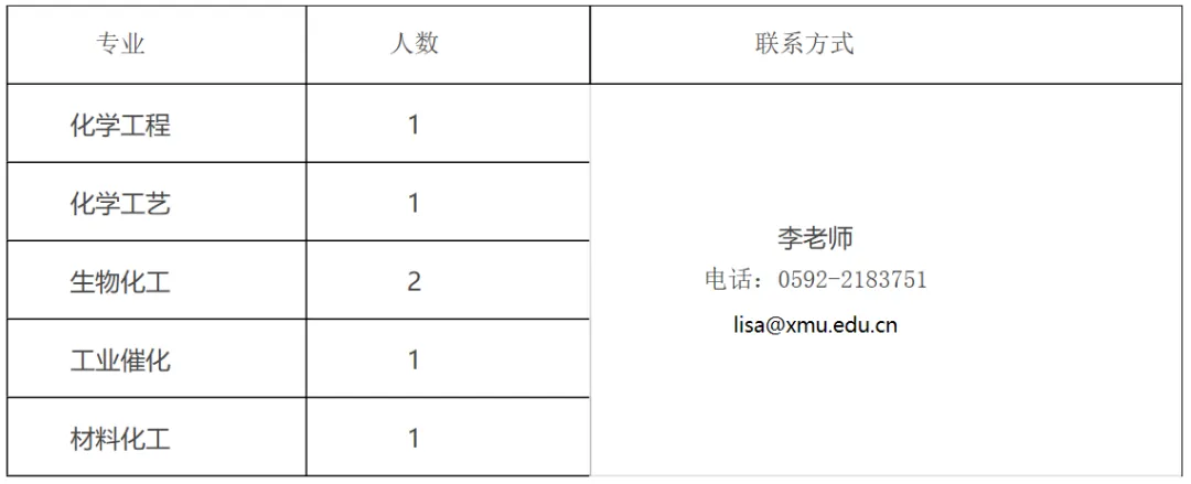 有意向的调剂考生,报名时间截止于5月12号,报名的考生按照我校招生办《厦门大学2020年硕士研究生复试录取工作方案》填写附件1调剂申请表《厦门大学2020年硕士研究生调剂申请表》和附件2《调剂学生信息汇总表-化工学硕》,发送到指定邮箱(以邮件报名为准)
