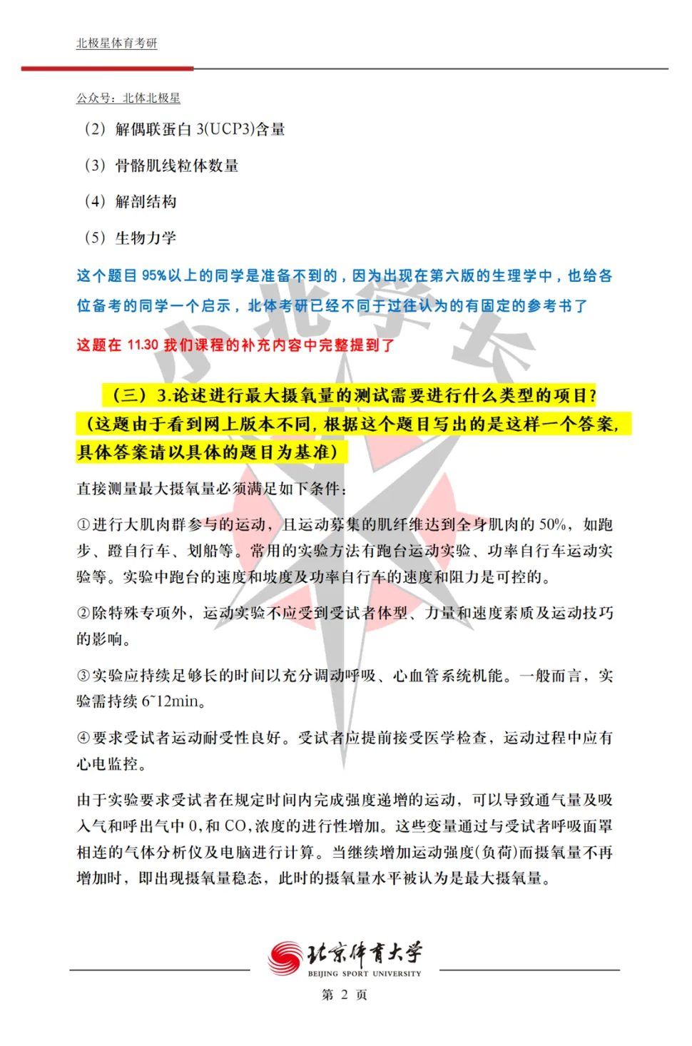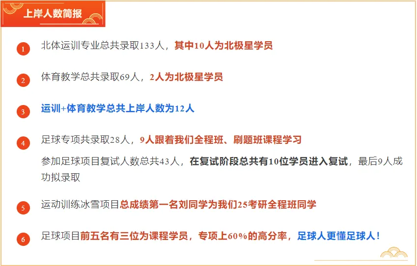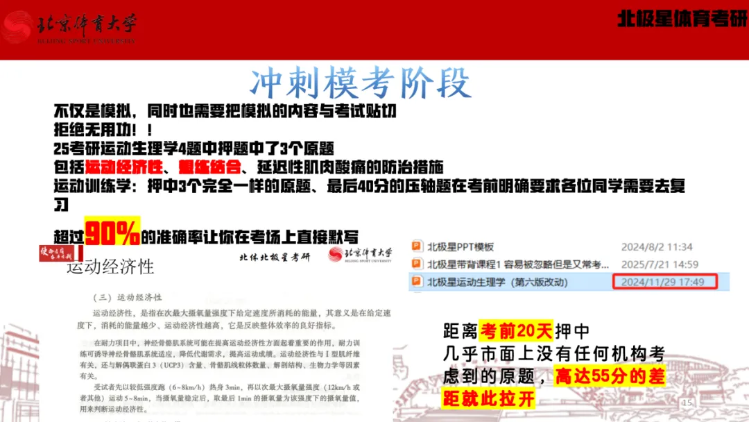 信息更新快,需要及时跟进:北体考情、政策、重点可能有变化,全程班能第一时间传递信息,让你备考不脱节。举个最为简单的例子,在25考研的时候,刚好新出了第六版运动生理学教材,同年25考研北体考到了从未考过,且只出现在第六版教材中的题目——运动经济性,这个题目我们在考前1个月专门讲到了!!