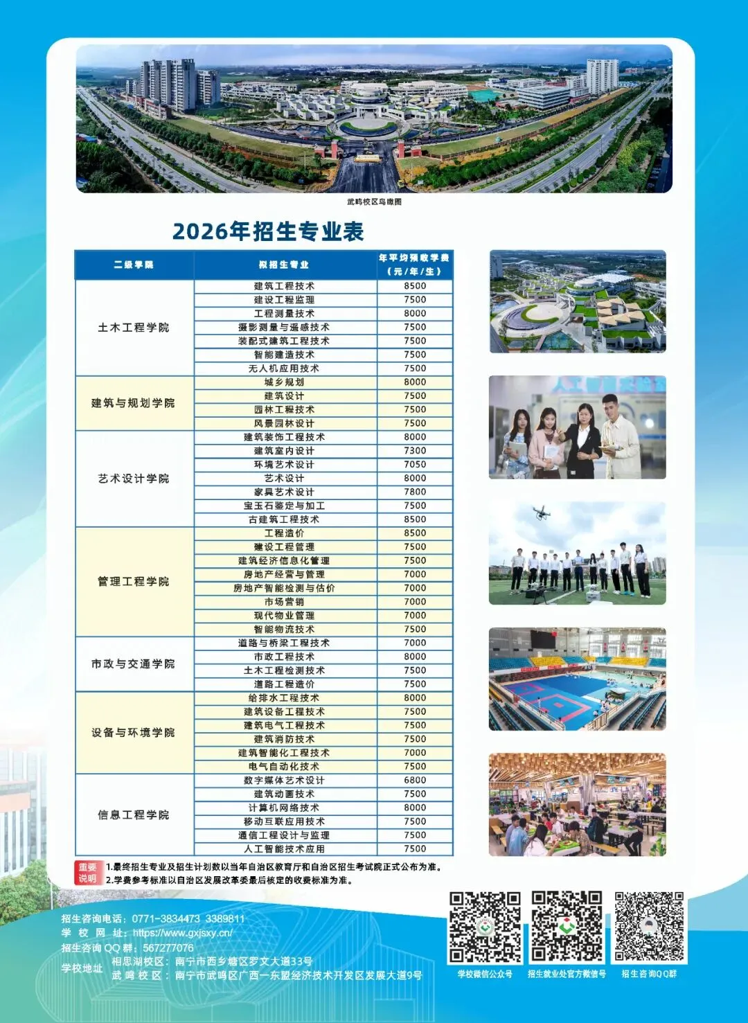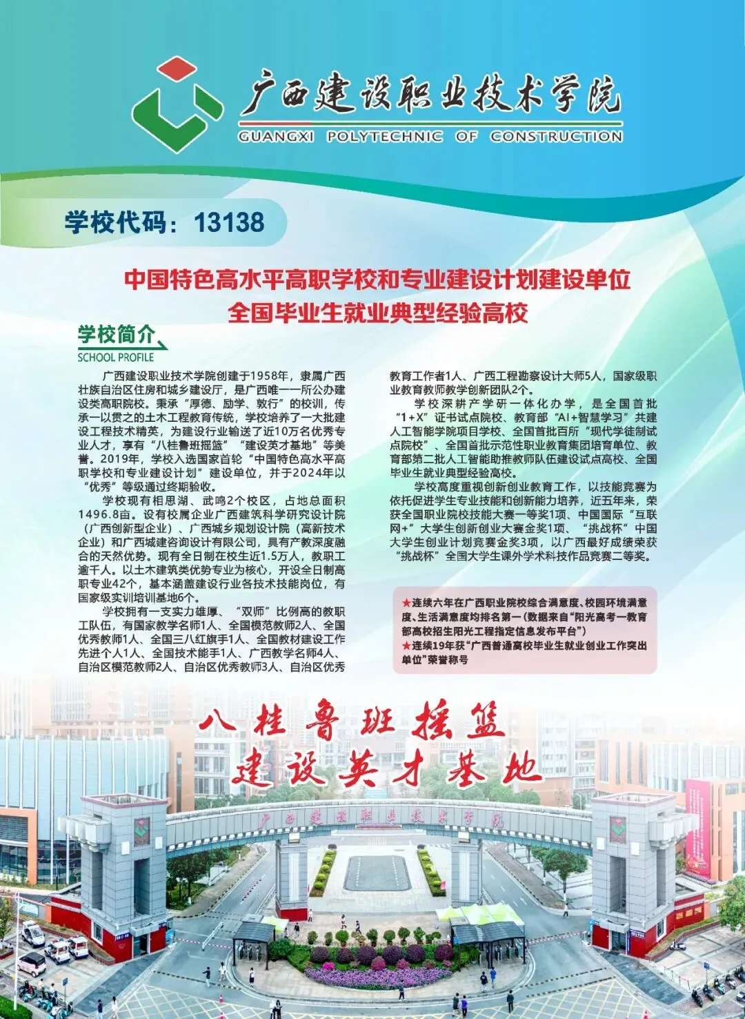广西建设职业技术学院创建于1958年,隶属广西壮族自治区住房和城乡建设厅,是广西唯一一所公办建设类高职院校。秉承“厚德、励学、敦行”的校训,传承一以贯之的土木工程教育传统,学校培养了一大批建设工程技术精英,为建设行业输送了近10万名优秀专业人才,享有“通高等学校毕年,隶属广西壮族自治区住房和城乡建设厅,是广西唯一一所公办建设类高职院校。秉承“厚德、励学、敦行”的校训,传承一以贯之的土木工程教育传统,学校培养了一大批建设工程技术精英,为建设行业输送了近10万名优秀专业人才,享有“八桂鲁班摇篮”“建设英才基地”等美誉。2019年,入选中国特色高水平高职学校和专业建设计划建设单位。2022年,以优秀等次通过“广西高水平高职学校”建设验收。第二章 组织机构及其职责