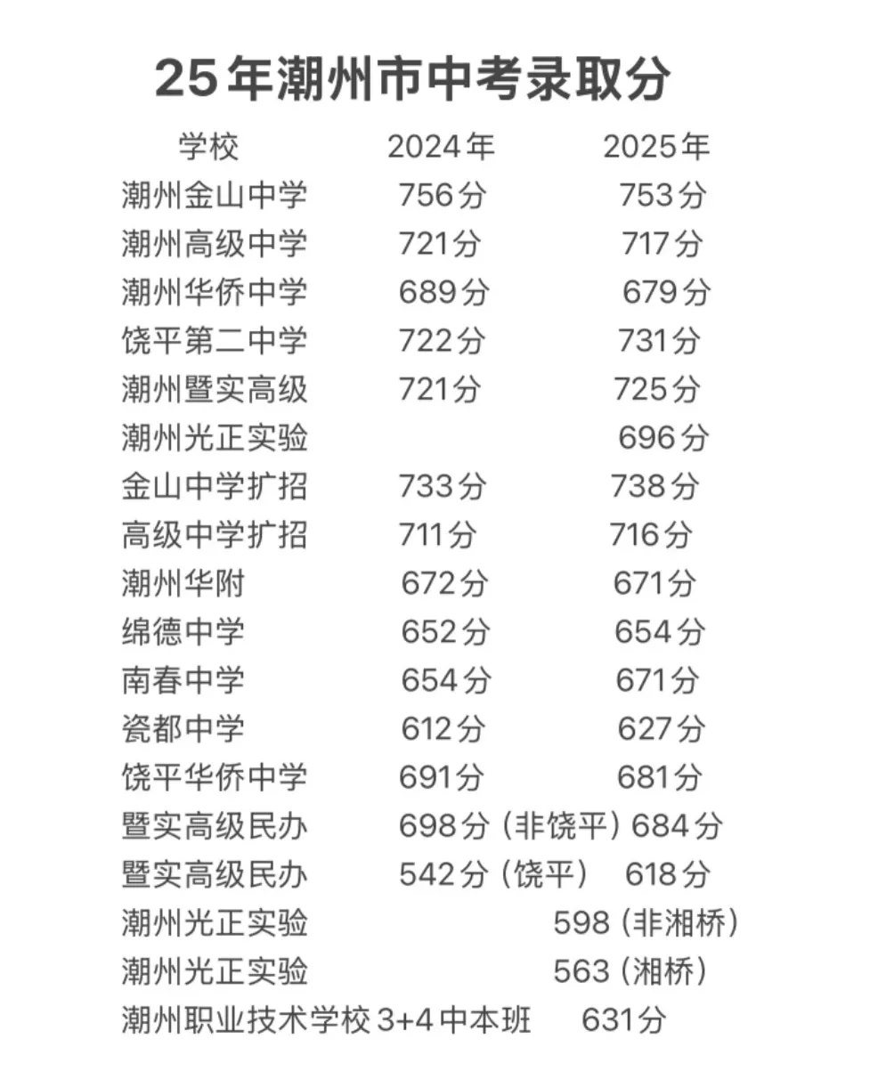 潮州市高级中学 | 717 | 714-722 | 市属优质公办,属地招生,50%指标到校,扩招影响小幅拉低分数线(±3分) |