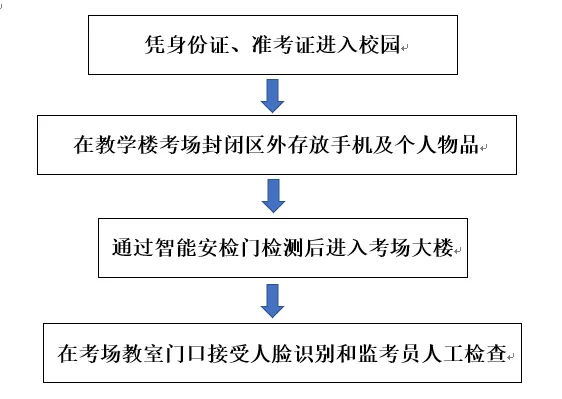 按照上级部门要求,本考点在北教学楼设置考场封闭区。考生进入校园后,须将物品存放在考点指定区域(北教学楼一楼架空层存包点),只准携带准考证、有效身份证件及符合规定的考试用品,通过智能安检门检查后进入考场封闭区。严禁考生携带各类电子通讯工具(如手机、智能手表、智能眼镜等穿戴设备)等物品进入考场封闭区域。