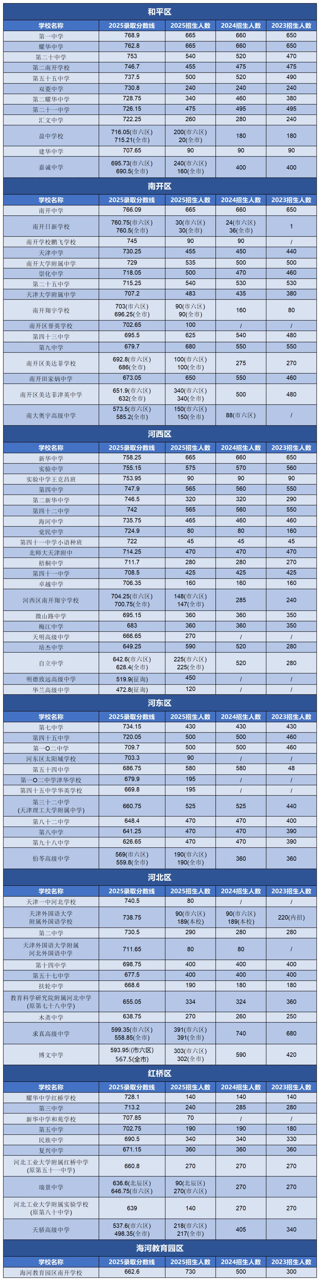 随着期末考试的结束,初三学子的中考冲刺倒计时正式开启,家长们的升学规划焦虑也随之升温:孩子当前分数能匹配哪所高中?心仪学校近三年招生名额有何变化?录取分数线是升是降?为解答这些核心疑问,我们耗时整理了2023-2025 年天津市内六区(和平、河西、南开、河东、河北、红桥)高中招生计划、录取分数线及位次数据,涵盖市重点、区重点、民办高中等全类型院校,横向对比各区升学难度,纵向追踪三年分数波动趋势。无论是冲刺头部名校,还是稳妥选择保底院校,这份数据都能为你提供精准参考,建议收藏转发,助力孩子科学规划升学路径!