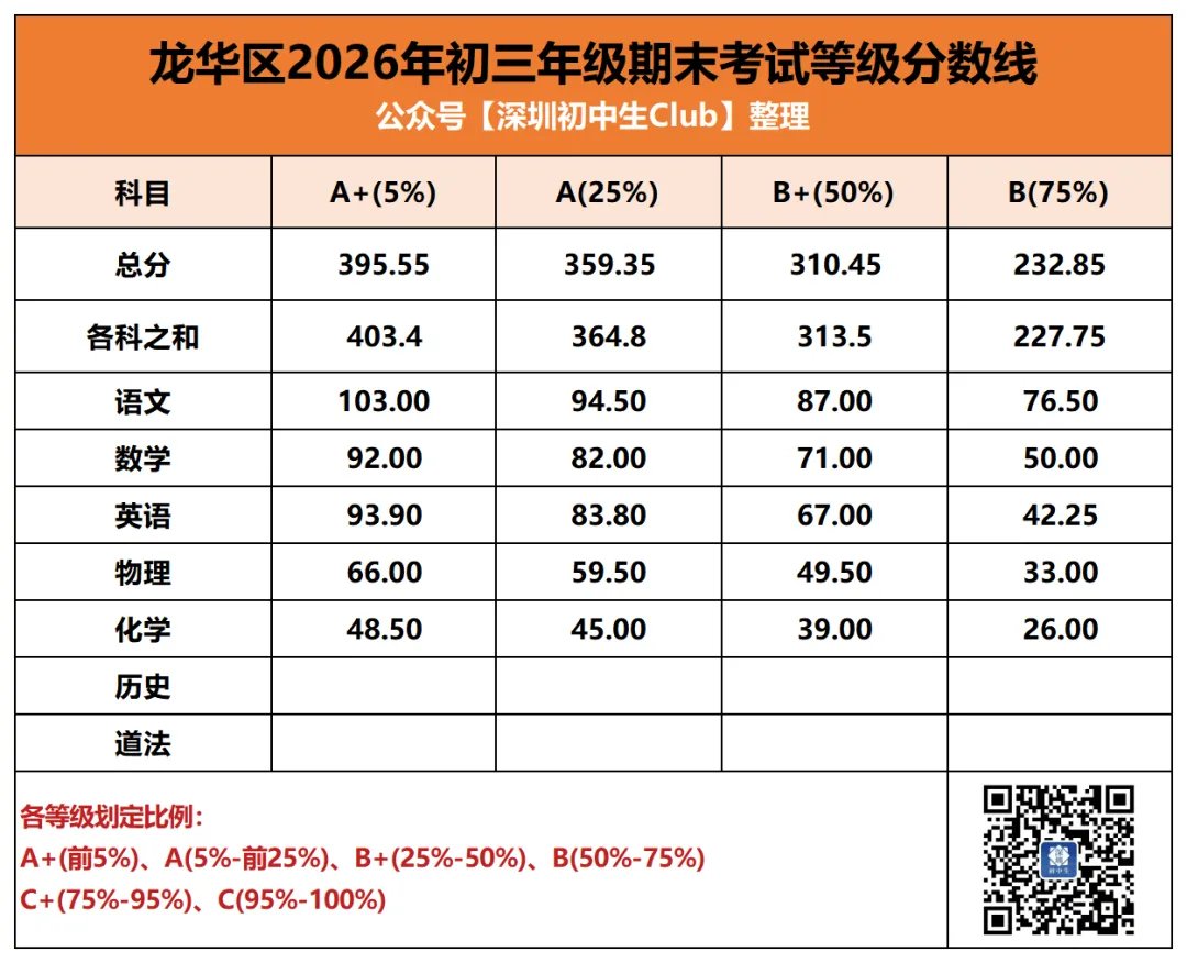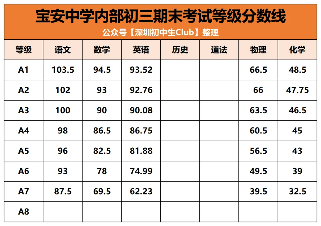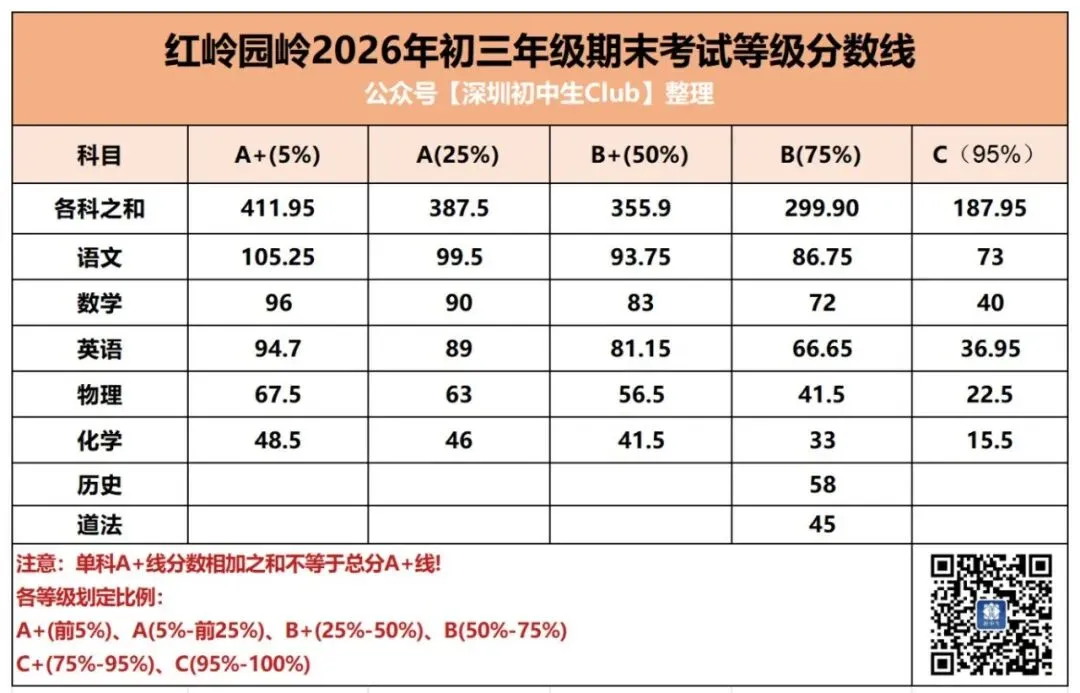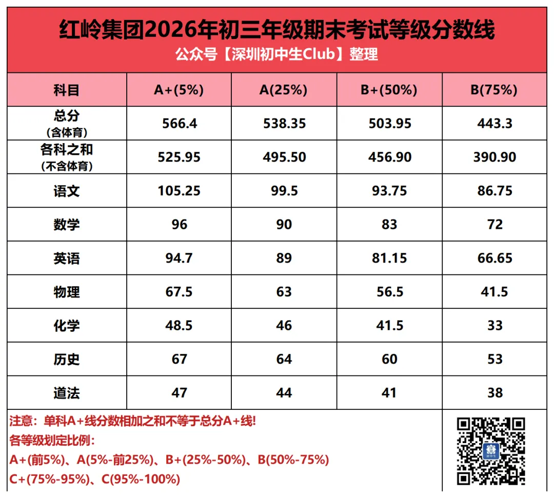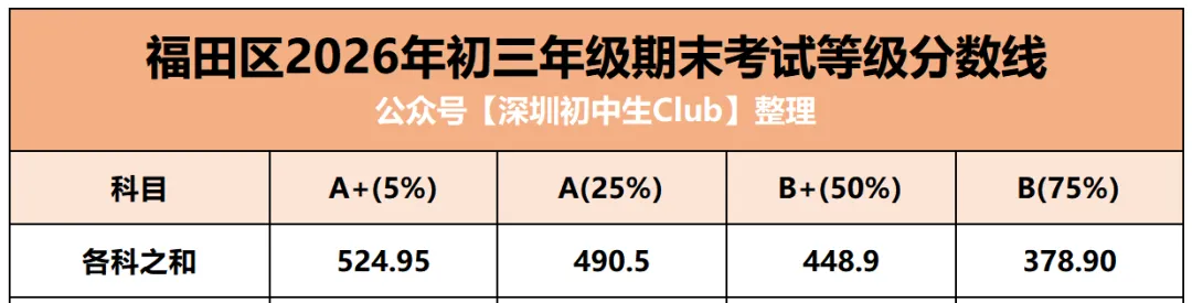 通过中考A+/A/B+段各科等级线之和(体育按满分计算),我们看到,深圳中考AC类录取结果: