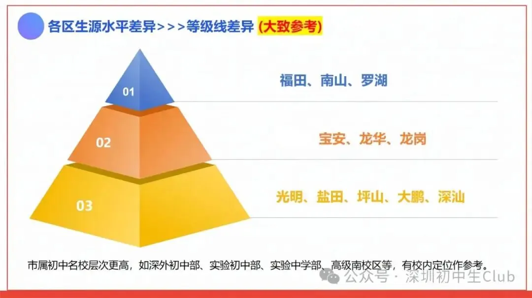 所以等级线对标高中时务必考虑到各区生源水平差距,比如说福田/南山的A段中上分数,可能已经对应到光明/盐田/坪山的A+线。参考往年经验,宝安区、龙岗区生源水平更接近于全市平均水准。