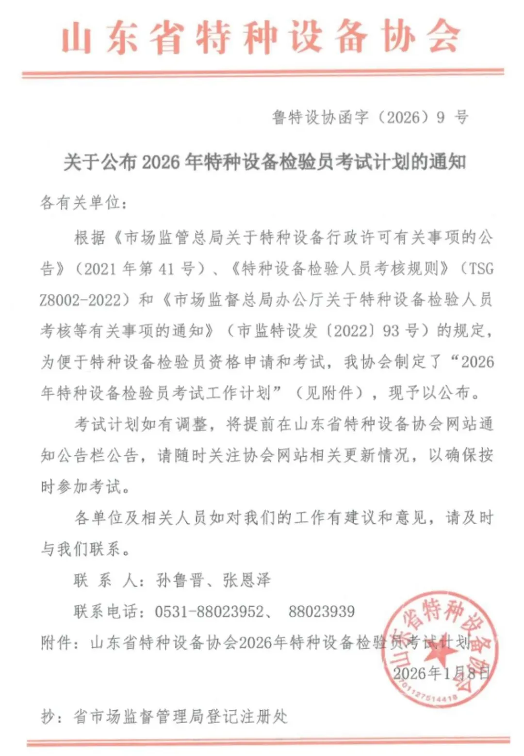 >山东:关于公布2026年电梯检验员考试计划的通知