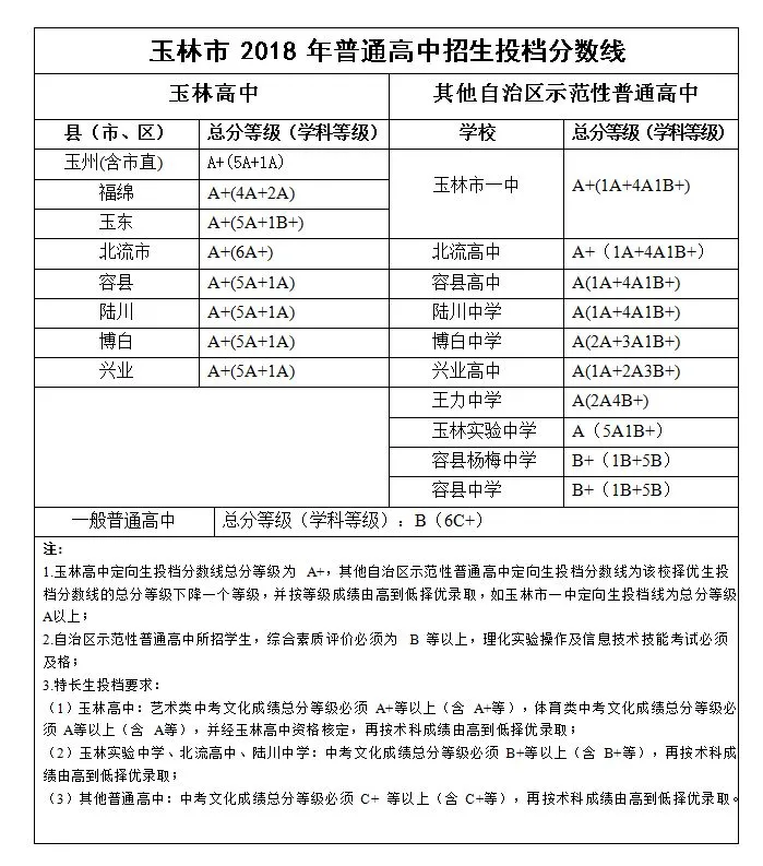 玉林市2018年普通高中招生投档分数线