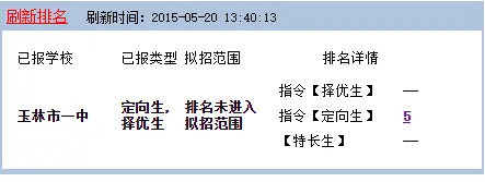 “刷新排名”按钮,可显示已报学校名称、已报类型、入围情况、排名详情,考生的排名只显示在择优生、定向生、特长生中的一列;