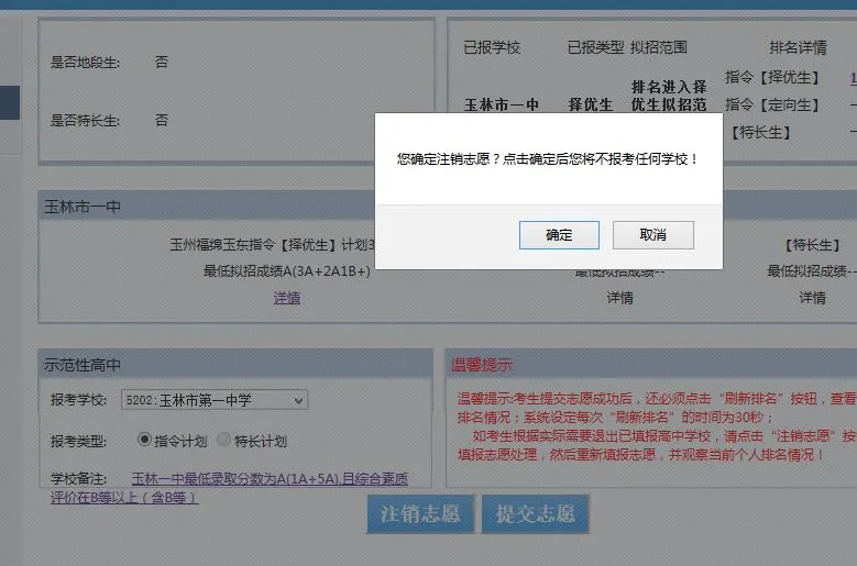 注意:如考生填报某个高中学校后,又确定不想报了,可以注销志愿,注销志愿后意味着该批次你没有填报任何志愿,也不会被该批次任何学校录取,请谨慎点击。