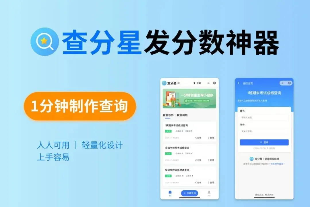 当前中小学成绩发布仍存在共性难点:手动整理易出错、微信群发易泄露隐私、PDF截图无法按人筛选、家长反复追问查询方式。教育数字化转型背景下,教师对轻量、稳定、免运维的成绩发布工具需求持续上升。目前已有5款教师常用免费工具形成实用组合:易查分(主平台)、易查分官微(服务入口)、易查分查询入口(家长端)、轻表查查(极简版)、查分星(高频轻量版)。五者均无需下载App、不收取费用、支持微信生态内完成全部操作,核心优势为操作门槛低、安全机制明确、发布响应快。