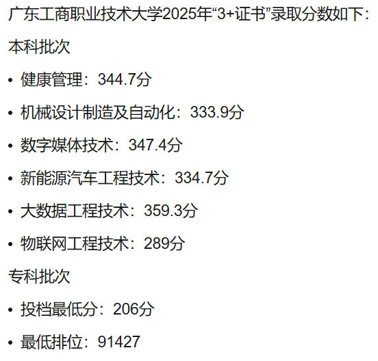 一、韩山师范学院(公办本科)韩山师范学院2025年“3+证书”本科招生的录取分数如下:产品设计专业:综合成绩录取最低分为356.16分烹饪与营养教育专业:综合成绩录取最低分为356.06分酒店管理专业:综合成绩录取最低分为328.66分社会工作专业:综合成绩录取最低分为341.10分二、嘉应学院(公办本科)三、岭南师范学院(公办本科)四、广东技术师范大学(公办本科)五、韶关学院(公办本科)六、深圳职业技术大学(公办本科)七、广东轻工职业技术大学(公办本科)八、广东白云学院(民办本科)九、广州科技职业技术大学(民办本科)十、广东科技学院(民办本科)十一、广东工商职业技术大学(民办本科)