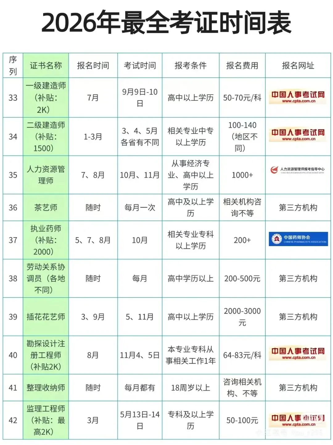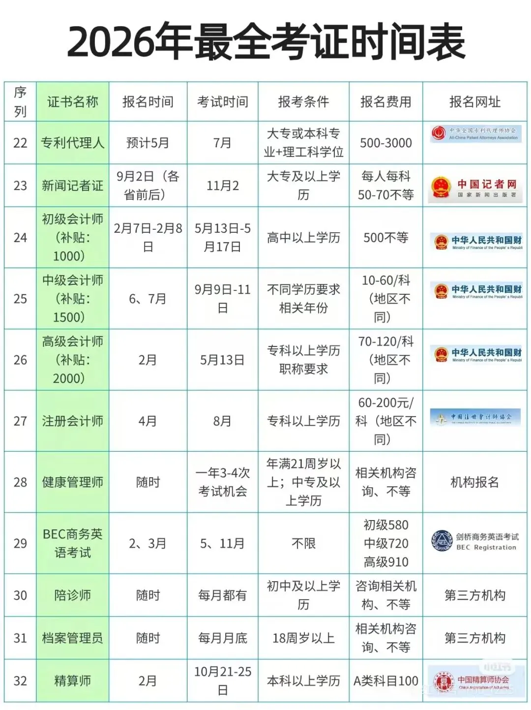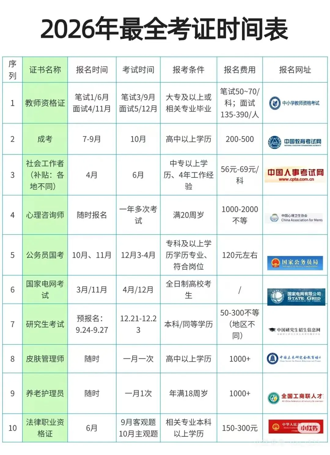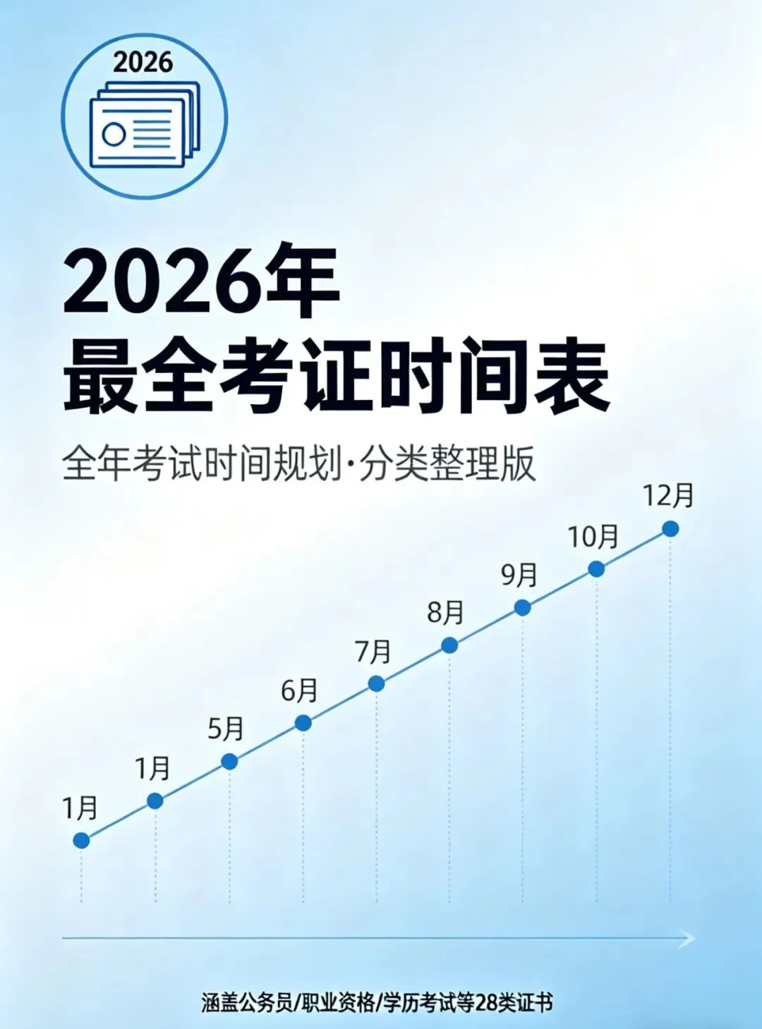 考证是提升个人竞争力、拓宽职业发展路径的重要方式。考证小助手整理了2026年的考证时间表,涵盖多个热门领域,如财会金融、建筑工程、医药卫生、职业资格、计算机、外语、学历提升等。梳理了2026年各类考试的时间安排,助你提前规划,高效备考。