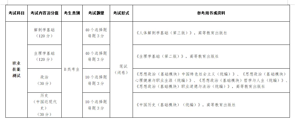 文化素质测试由学校依据《中等职业学校公共基础课课程标准》及高中教育阶段语文、数学、英语有关内容进行命题及考试,语文、数学、英语按 6:2:2 的分值比例分布,合计300分,考试时间为90分钟,采取笔试闭卷方式。职业技能测试由学校组织命题及考试,采取笔试闭卷方式,考试内容为解剖学基础、生理学基础、政治、历史(中国近现代史),试卷命题分值分别按 4:4:1:1比例分布,合计300分,考试时间为90分钟,重点考察学生的职业适应性。