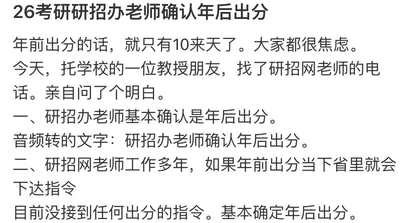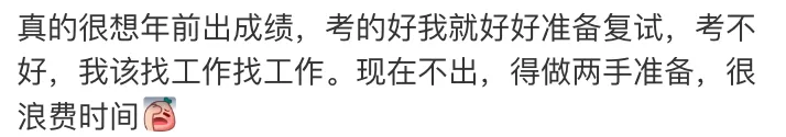 所以出分时间真的蛮影响人的,一是影响心情,二是影响后续的规划,最理想的是由官方先发布确切的公告说明成绩查询的准确具体的时间。