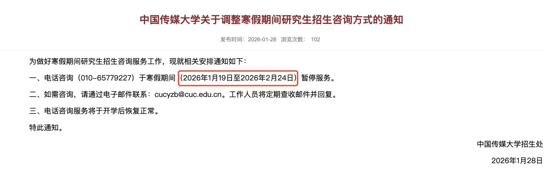 前两天中国传媒大学发布了调整寒假期间研究生招生咨询方式的通知,通知中明确了1月19日至2月24日暂停咨询服务。
