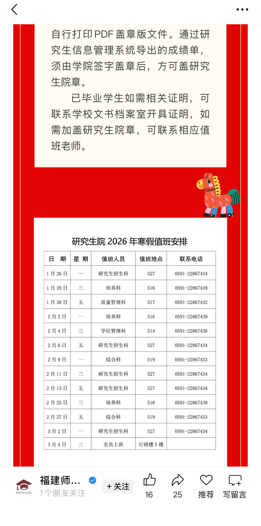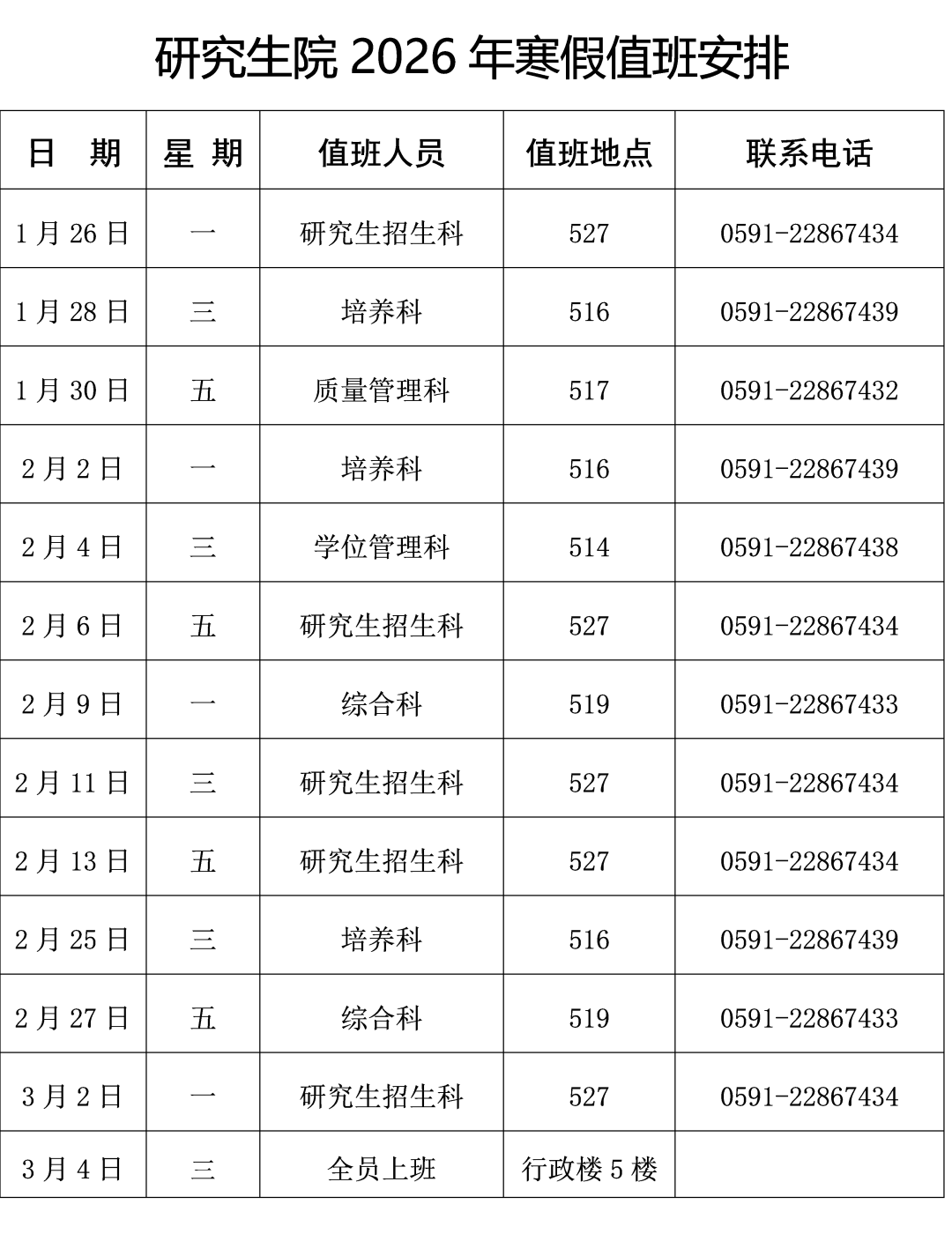 福建师范大学也发布了寒假时期的工作安排。我们可以看到研究生招生科在2月13日至3月2日之间是没有值班安排的。