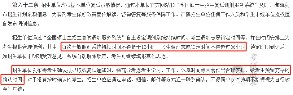 此外,《26年新规》中仍然强调:“招生单位发布需考生确认拟录取或复试通知时,需充分考虑考生学习、工作、休息时间等因素作出合理安排,给考生预留充裕的确认时间。对于没有按时确认的考生,招生单位应通过电话、短信、邮件等方式逐一联系确认。”这一规定,避免了往年出现过的“深夜发送调剂录取通知、两小时内确认”等不合理的调剂操作。